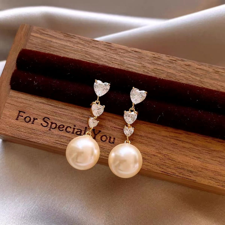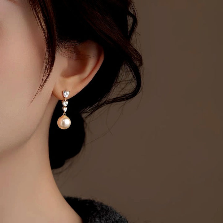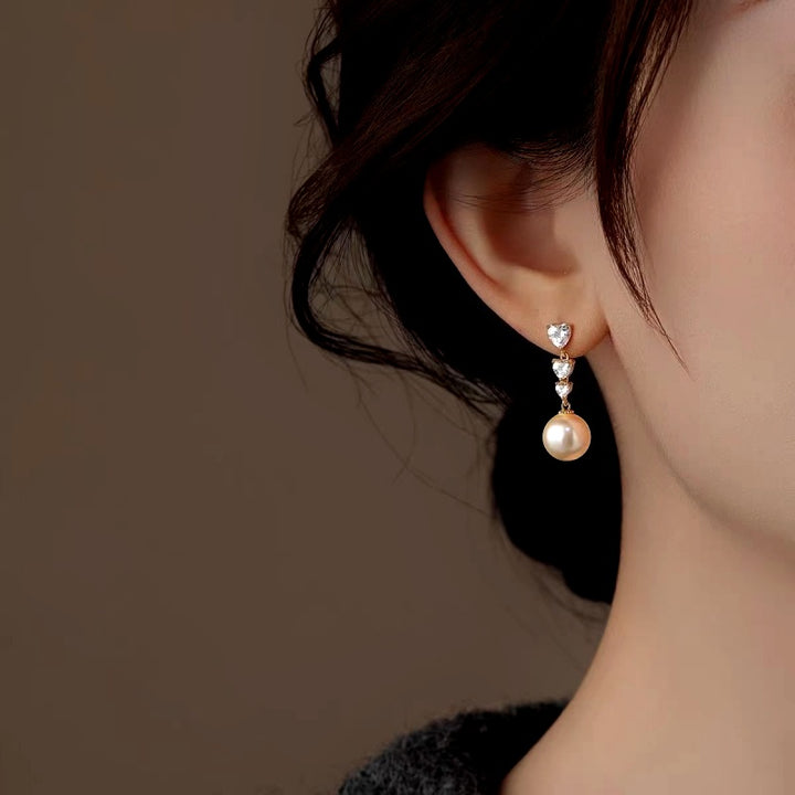 14K Gold-Plated Elegant Zircon Diamond Heart Pearl Tassel Earrings