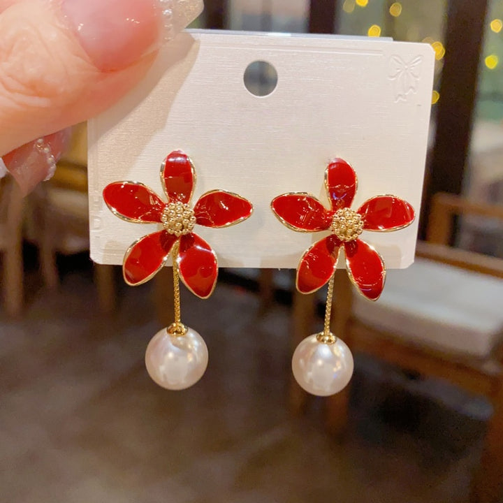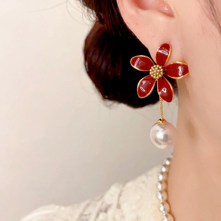 14K Gold-Plated Elegant Red Oil Drop Petal Flower Pearl Earrings