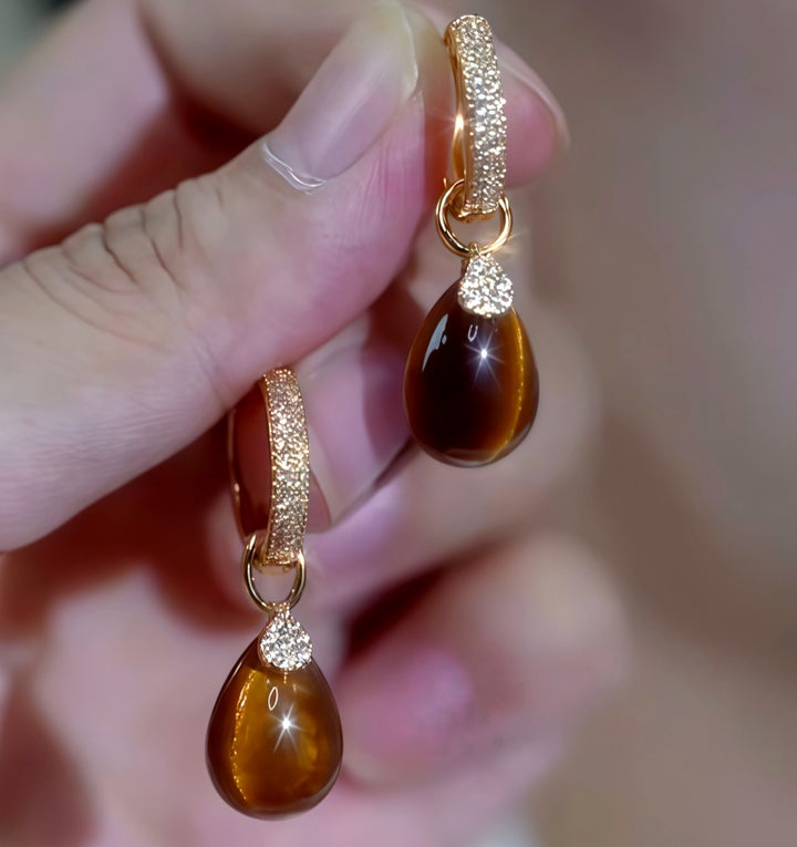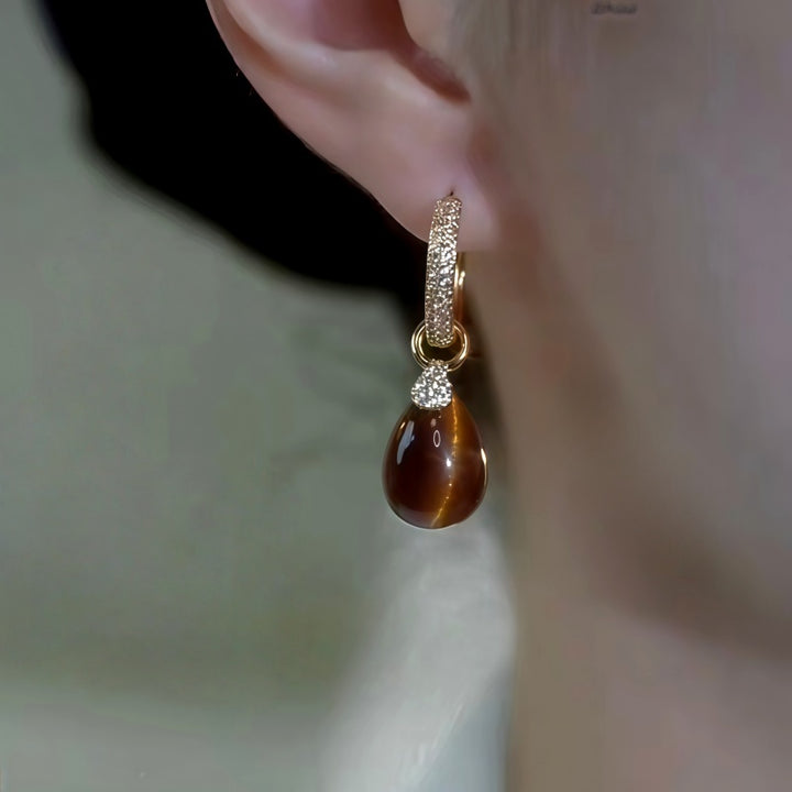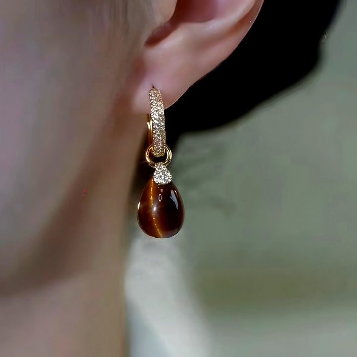 14K Gold-Plated Exquisite Zircon Tiger Eye Stone Water Drop Earrings
