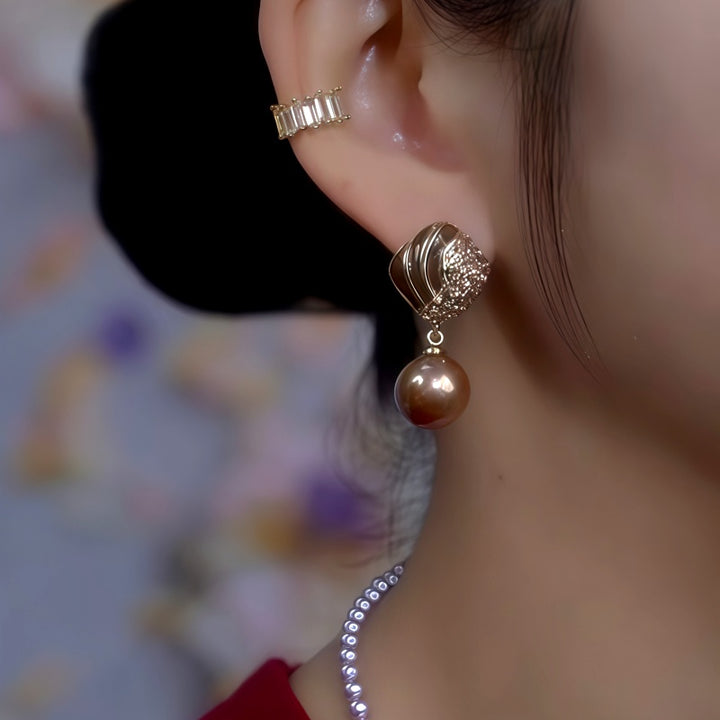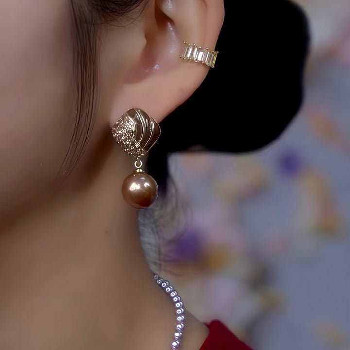 14K Gold-Plated Luxury Zircon Diamond Brown Bead Earrings