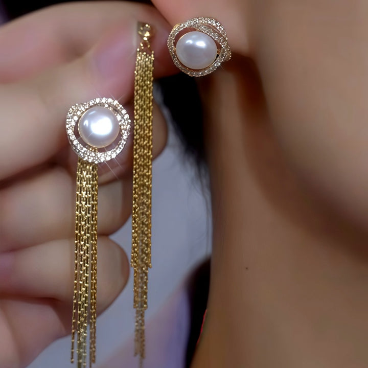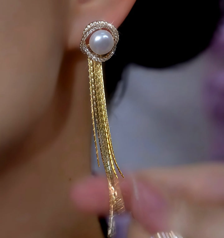14K Gold-Plated Luxury Zircon Diamond Pearl Tassel Earrings