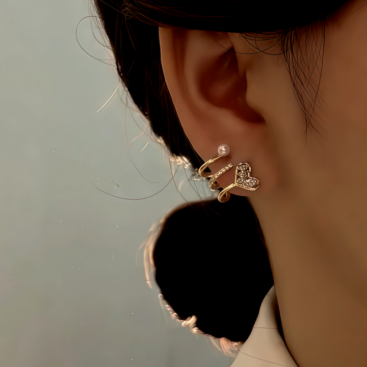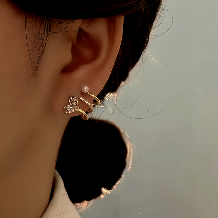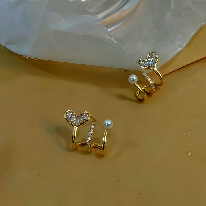 14K Gold-Plated Zircon Multi-Layer Heart Pearl Stud Earrings