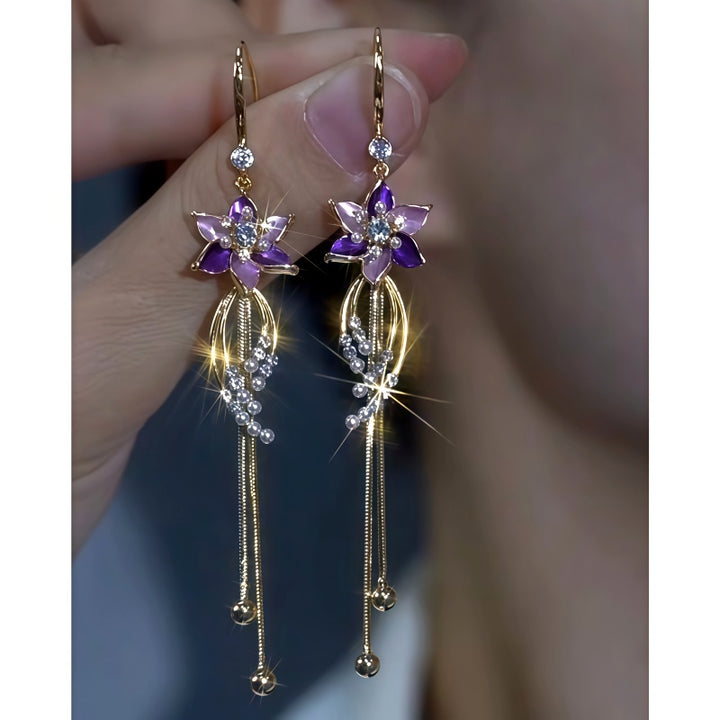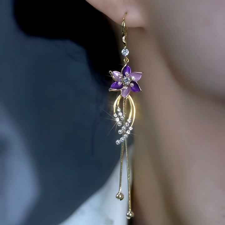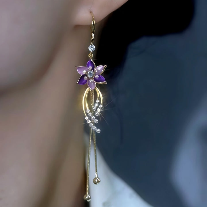 14K Gold-Plated Elegant Purple Flower Tassel Ear Hook Earrings
